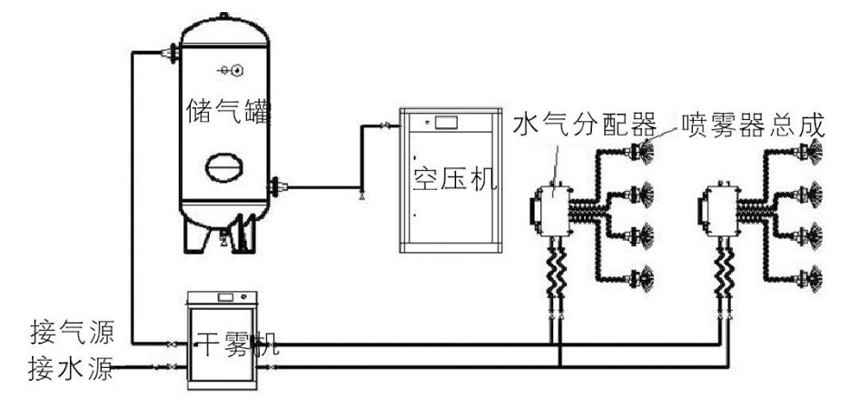 微霧抑塵裝置采用模塊化設(shè)計技術(shù)。由微霧機/干霧機、螺桿式空氣壓縮機、儲氣罐、噴霧器總成、微霧箱總成/水氣分配器、微霧箱總成控制器、水氣連接管線、電伴熱系統(tǒng)和自動控制系統(tǒng)等組成。