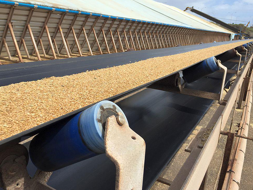 織物芯輸送帶是由多層浸膠尼龍(NN)帆布、聚酯(EP)帆布、EE型帆布為骨架材料,覆有具有不同性能的覆蓋膠,經(jīng)過(guò)壓延、成型、硫化等工序制作完成??椢镄据斔蛶Ь哂袔w彈性好、強(qiáng)力高、抗沖擊、耐屈撓性好、成槽性好、伸長(zhǎng)率低等優(yōu)勢(shì)。